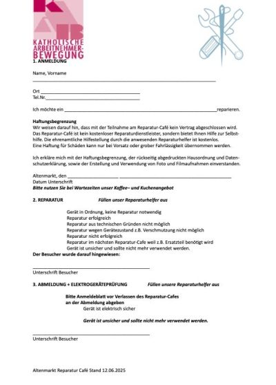 Klicken Sie rechts auf das Bild und laden Sie sich das Anmeldeformular herunter. Füllen Sie es aus und bringen Sie es zum nächsten Reparaturcafé-Termin einfach mit.